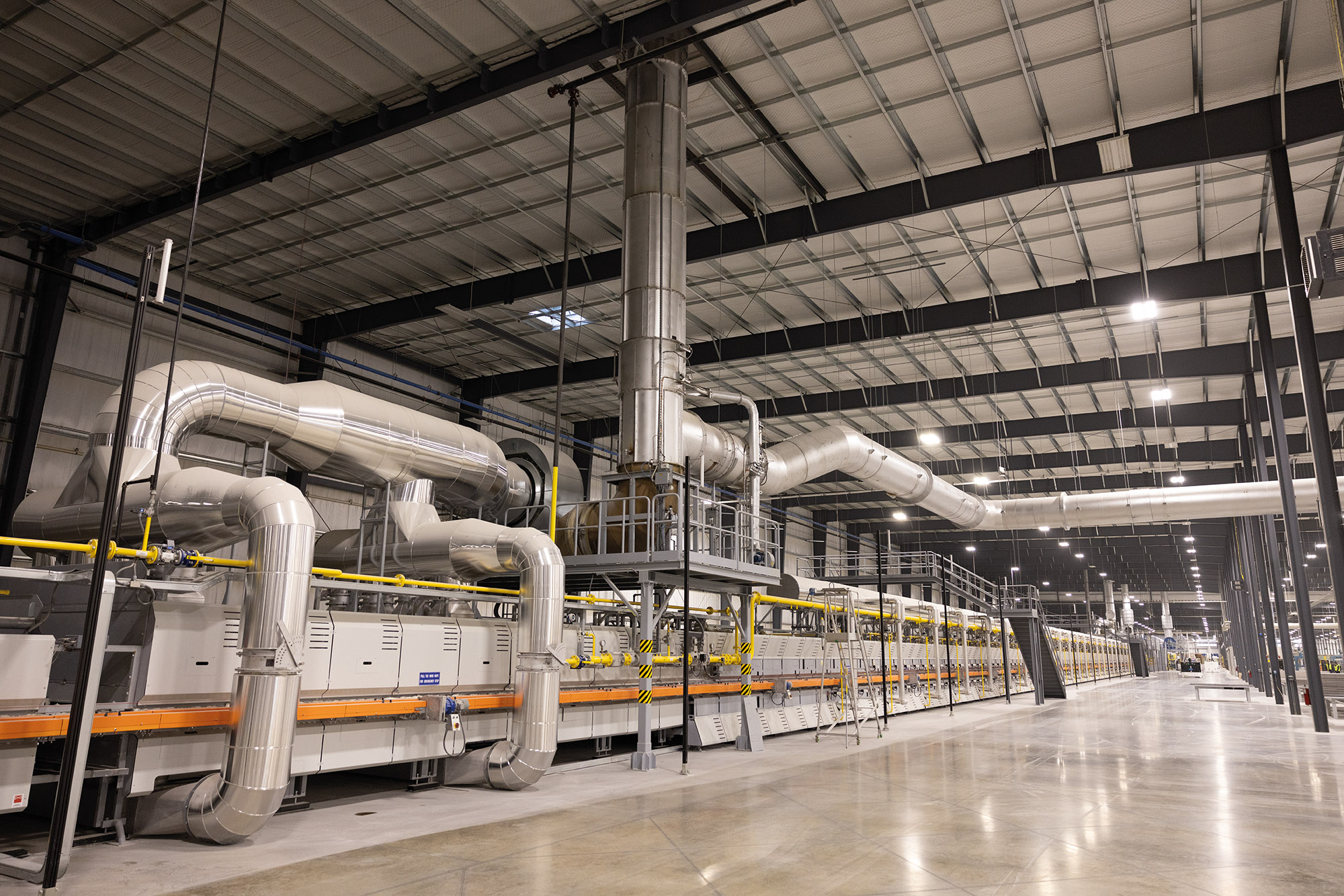 Our 200 meter long ceramic roller kiln is the same length as two soccer pitches. This area is where the tiles are fired and it is never turned off. This kiln runs 24 hours a day, 365 days a year.
